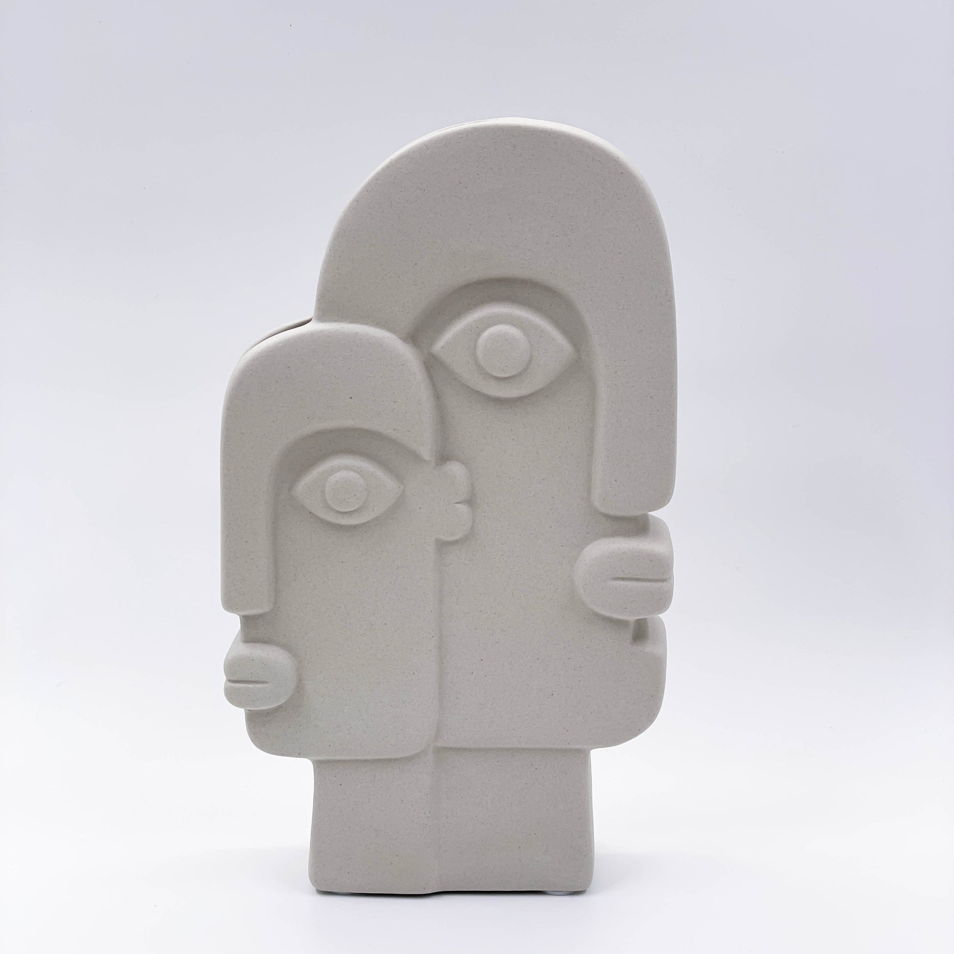 Two abstract faces meet to create a unique sculptural piece that serves as a miniature piece of art for your home. This vase is visually impactful on its own but can also create a fun, lively effect when florals or stems are added.